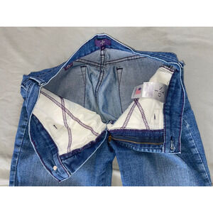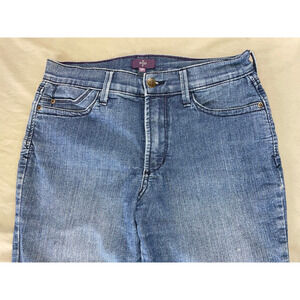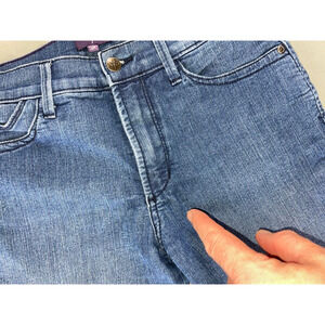 This awesome pair of jeans by NYDJ comes in a classic and versatile medium wash. They are flawed: there is a bit of very light stretching to the inner thighs (see pics). This is hard to see even when being looked for, and is highly unlikely to be noticeable under normal wear conditions/ The jeans are otherwise in good pre-owned condition with no other noted defects. They still look great and appear to have a ton of life left in them! We encourage you to use the zoom feature on our photos and we think you'll agree that this beautiful pair of jeans will make an excellent addition to your wardrobe! Please let us know if there is an angle or feature not represented that you would like to see prior to purchasing. Thanks for looking!