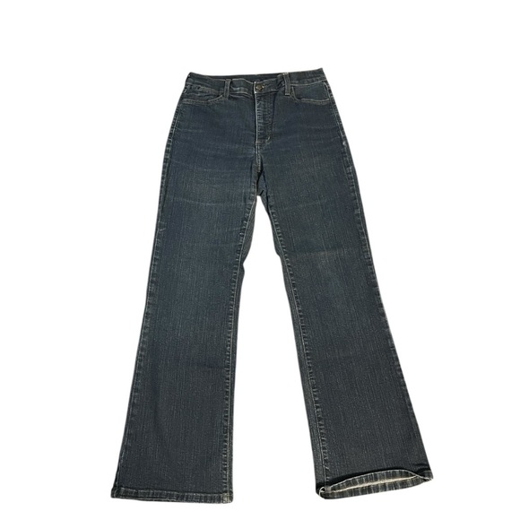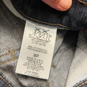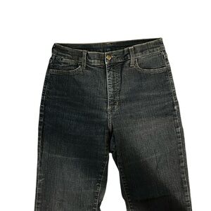 Stylish dark blue flare jeans by NYDJ. Embellishing on back pockets