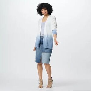 NYDJ Denim Midi Skirt Size 8 Front Patch- Clean Seline Knee Length Blue Fringe Hem