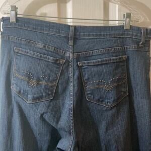 Not Your Daughters Jeans. Pockets on the front. Embellished pockets on the back. Jeans have beading/studs on the back. A few studs/beads are missing from the back left pocket (pictured). Small snag on the left leg (pictured) Pre-loved but a great fit! Dress up or dress down. Please see photos and video for additional transparency.