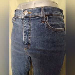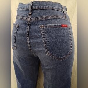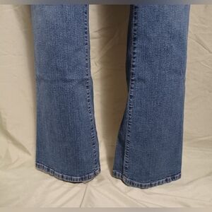 Tummy Tuck. Stylish wide leg flare jeans by NYDJ. Comfortable fit. Perfect for casual wear. red tag label at front coin pocket and back pocket. pre-owned. small amount of distressing at bottom of the leg hems. see pictures. they are part of the description. measurements are approximate.