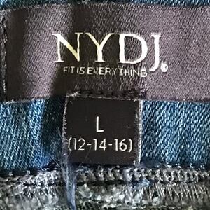 NYDJ women's jeans in medium wash straight leg. Features pull on style with lift x tuck technology with spanspring denim. Flat front with 2 back pockets. Waist measures 17 inches across front laying flat. Inseam measures 32 iinches. Size large as shown above (12-14-16).