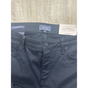 This is a pair of NYDJ Sheri Slim Ankle jeans in size 12, designed for women. The color is black and the style features riveted slits, giving it a modern and edgy look. These jeans are known for their slimming effect with the Lift Tuck technology by NYDJ. The product is brand new and priced at $99. Perfect for those looking for a comfortable and stylish pair of black jeans that offer a flattering fit.