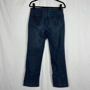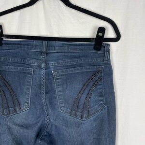 Dark Wash Stretch NYDJ Mid Rise Straight Leg Denim Jeans With Rhinestones On Back Pockets.