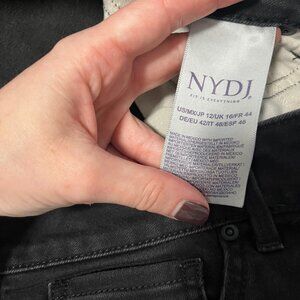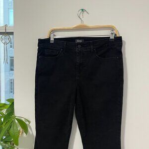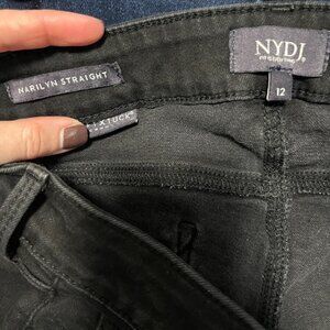 NYDJ Marilyn Straight Black Jeans Size 12. Solid black. Classic button & zip fly closure. Two front & back pockets. Straight fit/style. Full pant length. Stretchy material.