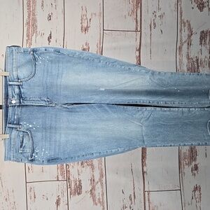 NYDJ Marilyn Straight Jeans in "Sandspur". Light wash with intentional areas of white bleach spots and some distressing. Very good preowned condition, Size: 18W