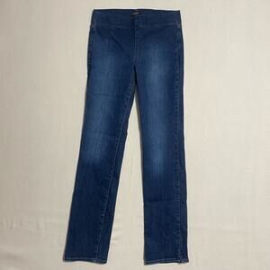 These are a classic pair of NYDJ (Not Your Daughter's Jeans) Marilyn Straight Leg jeans in a versatile dark wash. They are a pull-on style, offering a smooth, comfortable fit without a traditional button or zipper closure. As with all NYDJ denim, they feature the brand's exclusive Lift Tuck® Technology, designed to flatten the front and lift in the back for a flattering silhouette. The straight-leg cut is timeless and can be dressed up or down.