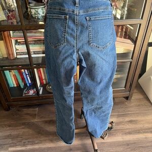 classic straight leg dark wash jean with comfort stretch. In excellent condition, no distressing. Waist 28, inseam 28.