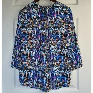 NYDJ Multicolor Pintuck Henley Blouse S pleated back hidden buttons 3/4 sleeves