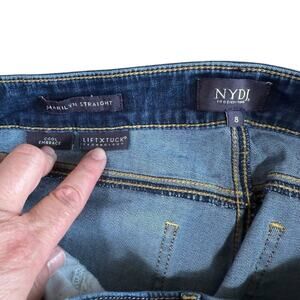 The product is a pair of NYDJ Not Your Daughters Jeans in a women's size 8, in a cool blue Marilyn straight crop style. These jeans feature a solid pattern with a medium wash denim fabric. They have a zip and button closure, a 5-pocket design, and are machine washable. The jeans are accented with buttons, zippers, and the NYDJ logo, and they are part of the regular fit collection. Perfect for the spring, summer, and fall seasons, these cropped jeans are a stylish choice for women who embrace a classic yet modern look. These jeans are in good condition and are from a smoke free home. Measurements are available in photos.