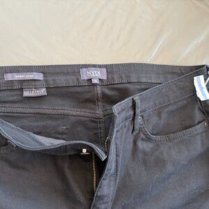 NYDJ Sheri Slim jeans. Features: Zip fly with button closure, five-pocket silhouette. Slim-leg silhouette. High rise: 9.75". Regular inseam: 30". Leg opening: 14" Exclusive Lift Tuck Technology® makes you look one size smaller by gently slimming the front and lifting the rear. 88% cotton/10% polyester/2% elastane. Machine wash. Size 14. Brand new. Color is Black. Smoke-free home.