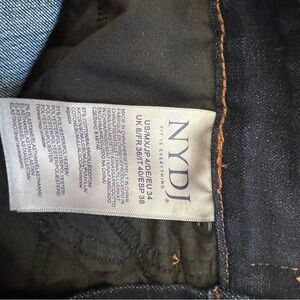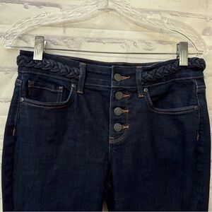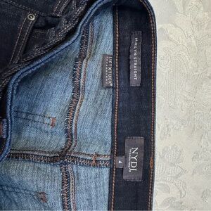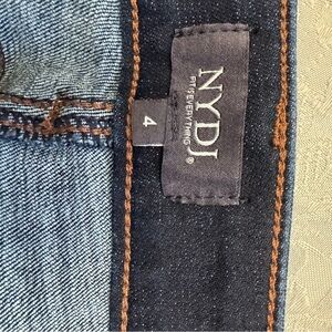 NYJD Marilyn magical dark blue jeans size 4 26 in inseam. Stretch. Braiding by belt loops, button fly.