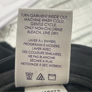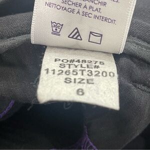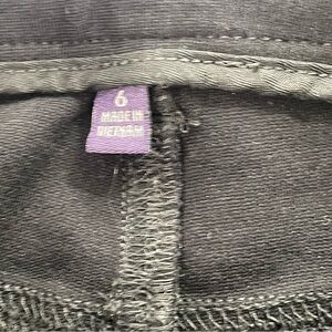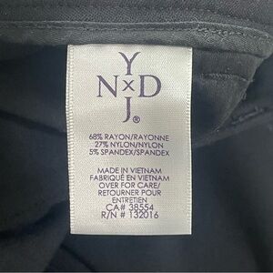 These NYDJ Skinny Tuxedo Strip Stretch Tummy Control Jeans are a stylish choice for a size 6 woman. The jeans feature a solid black color with double tuxedo-style shiny stripes on the outer legs, adding a touch of glamour. Made from a blend of nylon, spandex, and rayon, they offer comfort and stretch, ideal for everyday wear. The mid-rise fit and tummy control panel enhance the silhouette, while the 5-pocket design adds functionality to the fashionable design. Perfect for any season, these jeans are a versatile addition to any wardrobe. Colors may vary due to lighting, good used condition, size 6