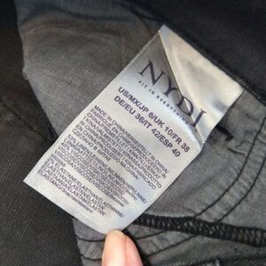 NYDJ charcoal gray linen blend straight leg pants with stretch, size 6. Nip and tuck slimming material. In gently preowned condition, no flaws noted.
