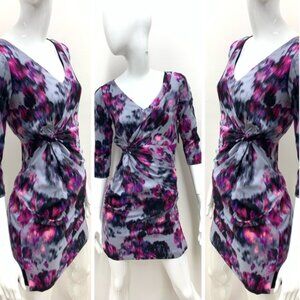NYDJ Sylvia berry and periwinkle watercolor floral print chiffon shaper twist front faux wrap dress, fully lined and with built in mesh shapewear half slip underneath with lift tuck technology for contouring your curves! 93% polyester/7% elastane