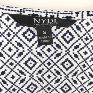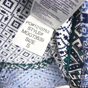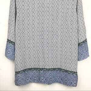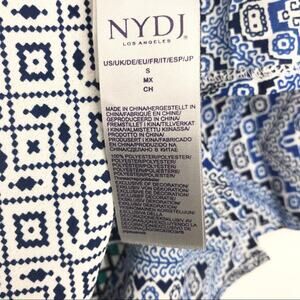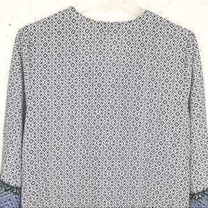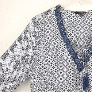 NYDJ Womens Beaded V-Neck Tassel Blouse 3/4 Sleeve Geometric Pattern Blue Small