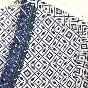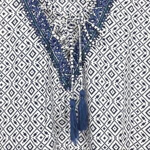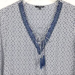 NYDJ Womens Beaded V-Neck Tassel Blouse 3/4 Sleeve Geometric Pattern Blue