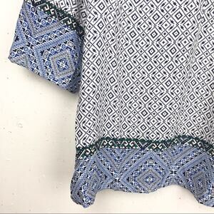 Features: 27" length, 21" pit to pit, lace up tie v-neck, 3/4 sleeves, side vents, beaded v-neck, tassels, geometric pattern, color blocking, stripes, green/blue/black/white.