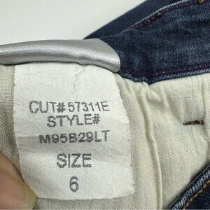 NYDJ size 6, they are a skinny style, mid-rise, dark wash, 5 pockets, belt loops, some stretch, whiskering, button and zip closure. Materials 91% cotton, 7% polyester, 2% spandex. Care machine wash cold, lay flat to dry. RN#132016 MFSR $125.00. Condition is preloved very good as shown in pictures. Please preview the measurements below to ensure fit.