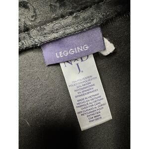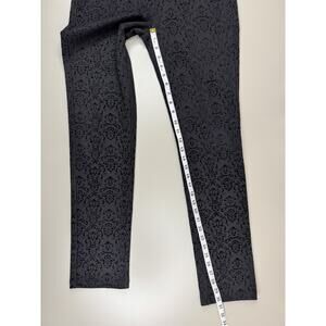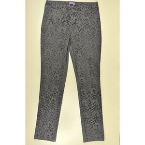 NYDJ (Not Your Daughter’s Jeans) women’s legging-style pants featuring an elegant black flocked damask pattern on a gray stretch base. These are pull-on leggings with a slim/skinny silhouette and comfortable stretch, perfect for dressy casual or workwear looks.
