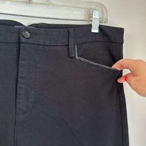 Super comfortable everyday black pant. Perfect for the office or going out! Neutral and will pair either anything you own. There is satin fabric around the pockets. A little bit of wear is in these areas. Otherwise pants are in great shape!