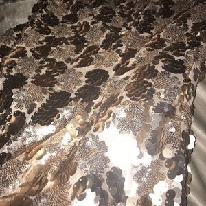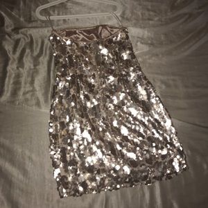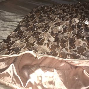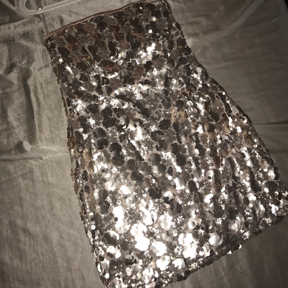 Gold Sequined Mini from Jessica McClintock, its strapless, size 12(true to size) with a hidden zip in the back. great for a night out, bday party, and especially NYE!! The Gold sequins have a matte satin finish, but as you see they sparkle just as bright! Inconsequential wear(shown) on the lining from double stick tape.