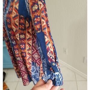 buttons top 1/3 native American print very colorful polyester and spandex blend