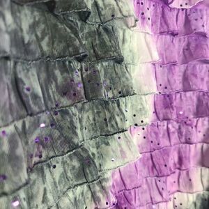 This is a grey, white, black, and purple long sleeve blouse. It has purple sequins and rows of ruffles.