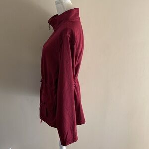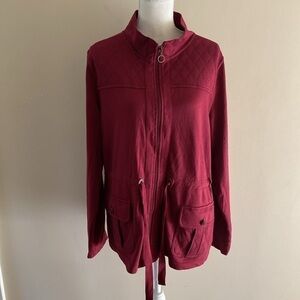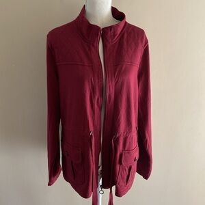 Size XL, cotton poly, soft fabric full zip, pockets, cranberry, mock neck, pit to pit 22.5”, length 28”