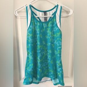 Stay stylish and comfortable with this vibrant teal and green patterned tank top. Perfect for workouts or casual outings.