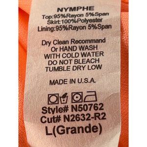 Made in the U.S.A. Top: 95% Rayon 5% Spandex Skirt: 100% Polyester Lining: 95: Rayon 5% Spandex Dry Clean Recommend or Hand Wash with cold water do not bleach tumble dry low STYLE N50762 CUT N2632-R2