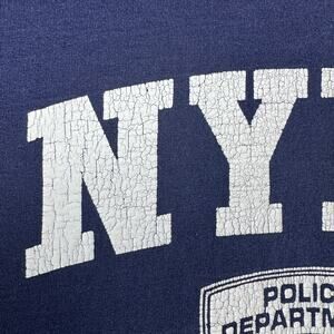 Here’s a solid piece of NYC memorabilia - a 2007 officially licensed NYPD t-shirt in a rich navy blue. This one features a bold cracked white print across the chest with the NYPD logo and “New York City Police Dept.” lettering underneath.