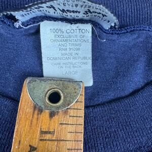 Made of 100% cotton and manufactured in the Dominican Republic, the tee shows expected wear for its age including some discoloration near the bottom right front and a small hole near the left shoulder, close to the neckline (see photos).