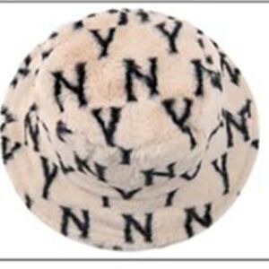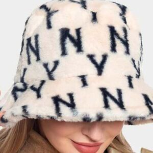 NY Patterned Beige Faux Fur Bucket Hat NWT
