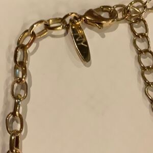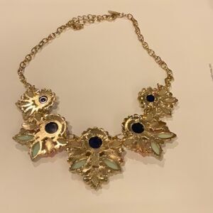 Beautiful NY statement necklace with blue, olive, peach and cream colored stones with rhinestones set in a gold plated setting in a beautiful flower like design and held by gold chains with an extension and lobster claw clasp. Beautiful addition to any summer or summer outfit.