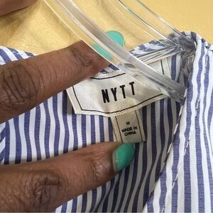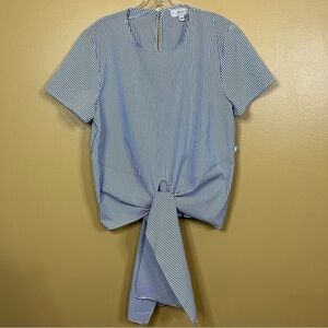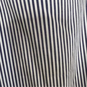 Blue and white stripe. Front tie. Pullover, peep hole with button in rear. Excellent condition. Smoke/pet free home.