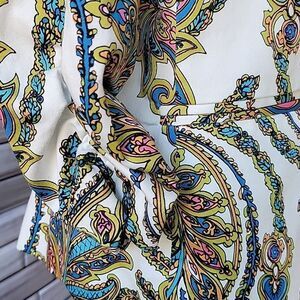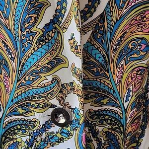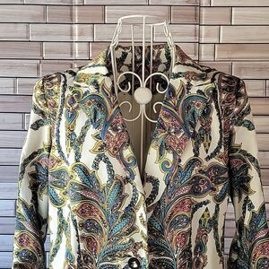 Paisley print cotton spandex blend, fully lined with a white polyester fabric blazer by NY collection. Collared with a one button closure and adorable ruched sleeves at the cuff. Like new condition