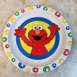 This is a pre-owned, round plate featuring Elmo from Sesame Street. The plate has a white base with a colorful swirl pattern around the rim. The center displays Elmo against a yellow and blue background. The plate shows signs of previous use, with minor surface scratches visible. The plate is approximately 8 inches in diameter and has a slightly raised edge.