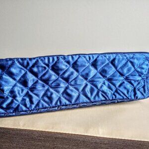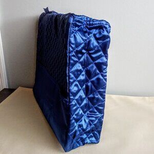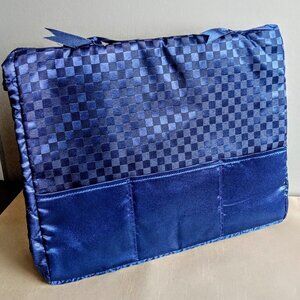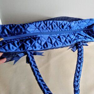 Blue satin quilted and checkered pattern bag from NaRaYa with a braided double handle with bows, 3 small outside pockets, 3 small inside pockets and 1 large zippered inside pocket.