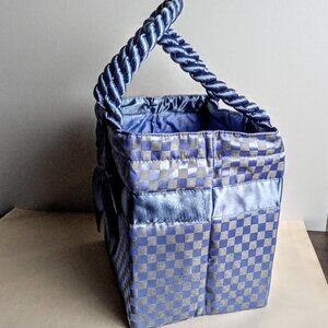 Cute little NaRaYa satin patterned tote bag with bow front detail, Velcro top closure and twisted double handle in blue.