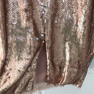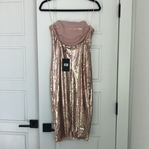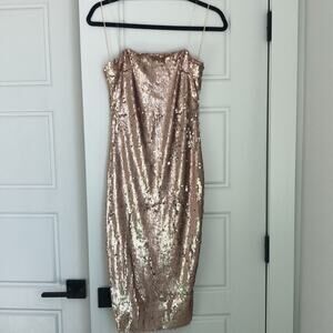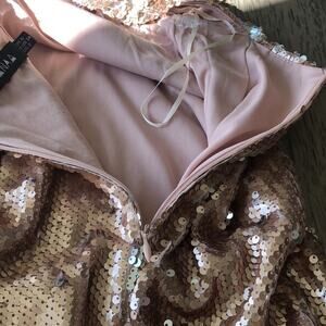 Show-stopping dress. The gorgeous gold sequins with the body-hugging fit are sure to turn heads. The sequins on this dress shine bright it is gorgeous. It is labeled as gold by the maker but it looks more of a rose gold. It also is called strapless but it does have small clear straps on the shoulders to keep everything in place, the straps are adjustable.
