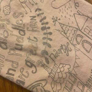 Light pink top with gray, blue, pink and purple polka dots and flowers. Gray stripes. Sleeves have houses, cupcakes, rain clouds along with cute rainy day sayings. Shirt has on very small, light stain on the back of the right sleeve. Other than that, it's in great condition.