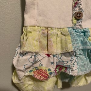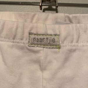 Girl's white and green leggings with green patterned ruffles and detailed wooden buttons Some stains as shown in photo Elastic waistband