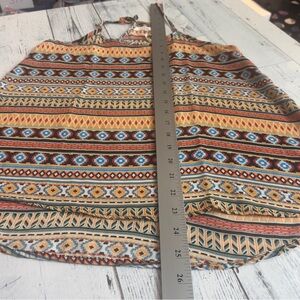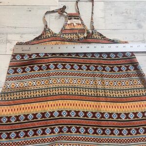 Multicolored Aztec print, spaghetti straps with a racerback, thread flaw on back at strap see picture, lightweight, colors may vary due to lighting, good used condition, XS