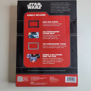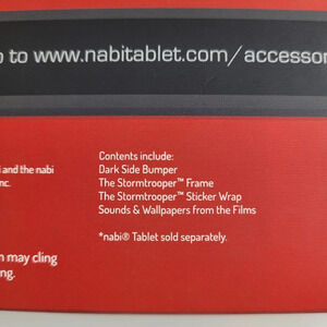 Nabi Collector’s Edition Star Wars accessory bundle, dark side version. The Star Wars dark side accessory bundle includes a sleek, black Drop-Safe bumper as well as a striking Stromtrooper frame and sticker wrap. You can also transform your tablet with a variety of sounds from the films and wallpapers that integrate into your everyday tablet use. • Stormtrooper Frame and Sticker Wrap Make your nabi Collector’s Edition complete with an exclusive Stormtrooper frame, and customize the back of your tablet with the collector’s edition Stormtrooper sticker wrap. • Sounds and Wallpaper From The Films Make your nabi Collector’s Edition a tablet from a galaxy far, far away with tons of sounds and wallpapers from the films. • Dark Side Bumper Protect your nabi Collector’s Edition with the black dark side bumper. This is NEW in original packaging **PLEASE NOTE** comes with Dark side bumper The stormtrooper frame The storm trooper sticker wrap Sounds and wallpapers from the film **Nabi tablet sold seperately