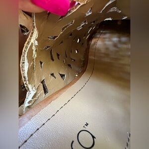 These brown clogs feature a beautifully detailed cut-out design on the leather upper, creating a sophisticated look. The high wooden heel and platform offer both height and stability, making them a stylish choice for any occasion.