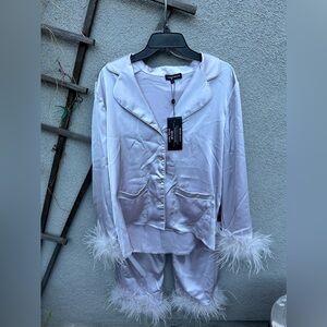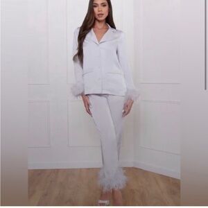 Here at NADINE MERABI we have spent time making these fit perfectly and feel wonderful when worn. With a feather trim to the cuff, White satin binding on the shirt and trouser hem cuff to give a luxurious feel.