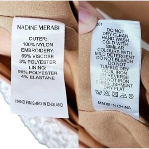 Elegant tan dress by Nadine Merabi. Perfect for special occasions.