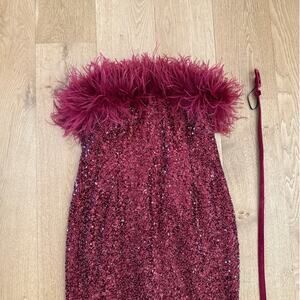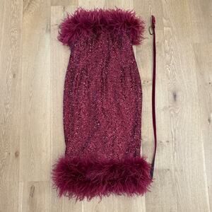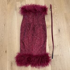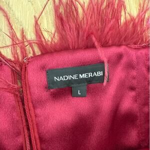 Nadine Merabi Strapless Dress Feather Trim Katie Size L Red
