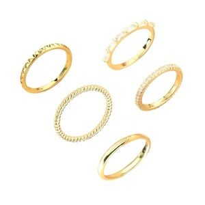This chic and minimalist set includes 5 slender rings that can be worn stacked or solo. Crafted from premium brass with a double layer of 14K gold plating, these rings are tarnish-resistant, hypoallergenic, waterproof, nickel/lead free, and durable. The simple, lightweight, and comfortable design makes them perfect for daily wear. Rings are brand new and in flawless condition.